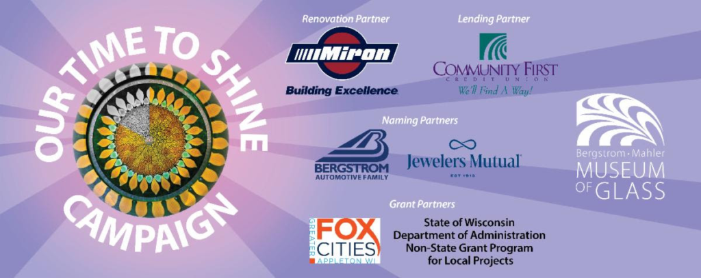 Bergstrom-Mahler Museum of Glass wishes to thank Miron Construction (building partner), Community First Credit Union (lending partner), Bergstrom Automotive Family, and Jewelers Mutual (naming partners), the State of Wisconsin Department of Administration Non-State Grant Program for Local Projects, and Fox Cities Visitor & Convention Bureau Tourism Grant Program.